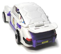 「ちなみに背中の甲羅はルーフ部にボンネットの一部とドアとリアウイングが畳まりこんだ集積体です。 車状態のルーフに亀甲モールドが入ってるのはこのためなのですね。」 |
